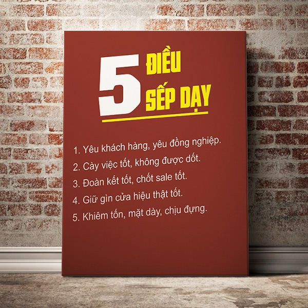 Tranh văn phòng 5 điều sếp dạy là một sản phẩm độc đáo và ý nghĩa dành cho các doanh nhân, nhân viên văn phòng và những người muốn trang trí không gian làm việc của mình. Tranh được thiết kế với 5 điều sếp dạy, bao gồm: Tôn trọng, Tận tâm, Chính trực, Sáng tạo và Đoàn kết. Những thông điệp này sẽ giúp bạn trở thành một nhân viên xuất sắc và đạt được thành công trong công việc. Tranh được in trên chất liệu vải canvas cao cấp, sử dụng công nghệ in ấn hiện đại, đảm bảo độ sắc nét và bền đẹp. Kích thước sản phẩm là 40x60cm, phù hợp với mọi không gian làm việc. Tranh văn phòng 5 điều sếp dạy là món quà ý nghĩa và độc đáo dành cho bạn bè, đồng nghiệp và người thân.