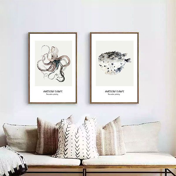 Bộ 2 tranh vẽ bạch tuộc và cá nóc CV02107 với hình ảnh vẽ con vật vô cùng đơn giản đem đến sự mới lạ cho không gian , tranh có thể treo trong không gian phòng khách hoặc quán cafe .