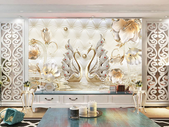 Tranh dán tường 3D đôi thiên nga ánh vàng TDT759 với hình ảnh 3D đôi thiên nga vô cùng cuốn hút cùng gam màu nổi bật sang trọng sẽ giúp thay đổi diện mạo hoàn toàn cho không gian của bạn  , tranh thích hợp với không gian phòng khách