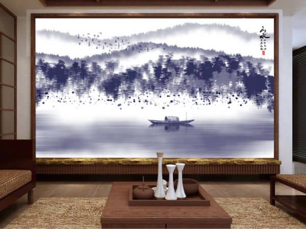 Tranh dán tường trừu tượng con thuyền và thiên nhiên núi rừng TDT207 với hình ảnh trừu tượng thiên nhiên bình lặng cùng sắc xanh trầm rất thích hợp với các không gian có lối kiến trúc xưa cũ , cổ điển . Tranh thích hợp với không gian phòng khách
