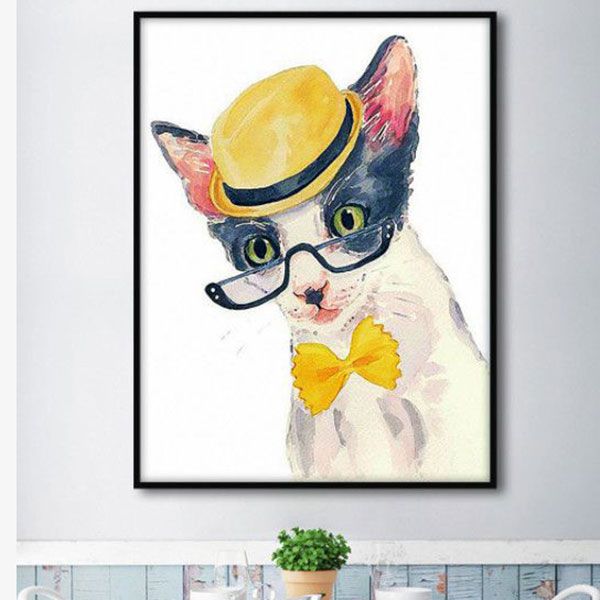Tranh đơn vẽ mèo đội mũ vàng CV01209 với hình ảnh chú mèo đội mũ , cài nơ vàng và đeo kính vô cùng mới lạ , đặc sắc , tranh thích hợp treo trong không gian phòng khách hoặc quán cafe .