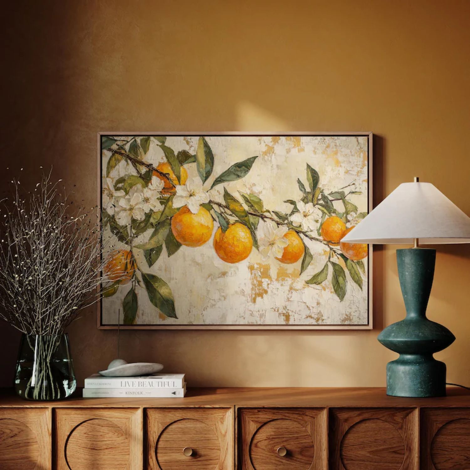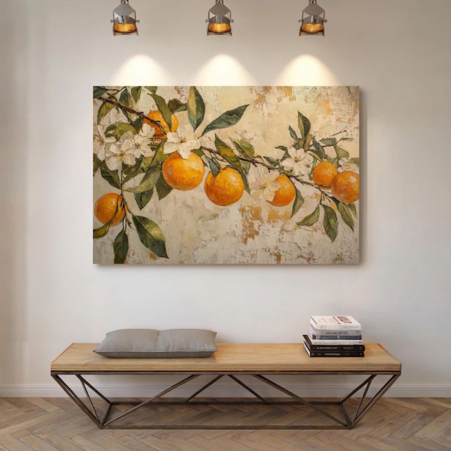 Bức tranh đẹp với hình ảnh cành cam trĩu quả kết hợp hoa trắng tinh khôi mang đến cảm giác tươi mới, ấm áp và đầy sức sống cho không gian nội thất. Gam màu vàng cam nổi bật trên nền be – trắng trung tính giúp tổng thể bức tranh hài hòa, sang trọng nhưng vẫn gần gũi với thiên nhiên.