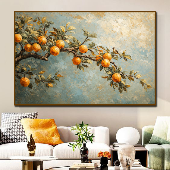 Bức tranh được in theo phong cách sơn dầu với hiệu ứng vân màu chân thực, tạo chiều sâu và cảm giác như một tác phẩm vẽ tay. Gam màu ấm nổi bật trên nền trung tính giúp bức tranh vừa thu hút ánh nhìn, vừa dễ phối với nhiều phong cách nội thất khác nhau.