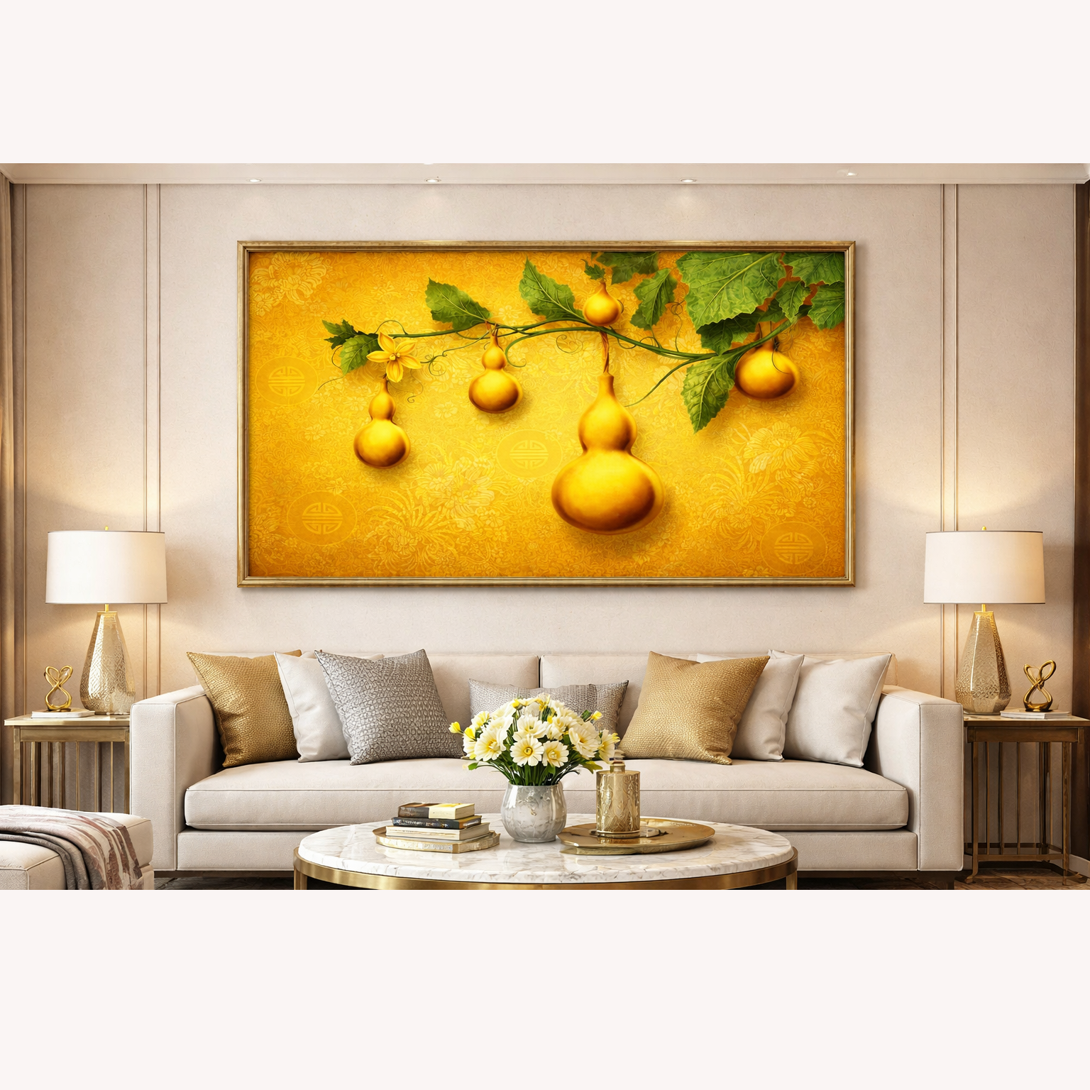 Tranh Phong Thủy Quả Hồ Lô May Mắn là dòng tranh trang trí cao cấp, mang ý nghĩa phong thủy sâu sắc, được nhiều gia đình và doanh nghiệp lựa chọn để treo trong phòng khách, phòng làm việc hoặc sảnh tiếp khách. Với hình ảnh quả hồ lô vàng căng tròn, treo sum suê trên cành xanh, bức tranh tượng trưng cho tài lộc – sức khỏe – trường thọ và may mắn bền lâu.